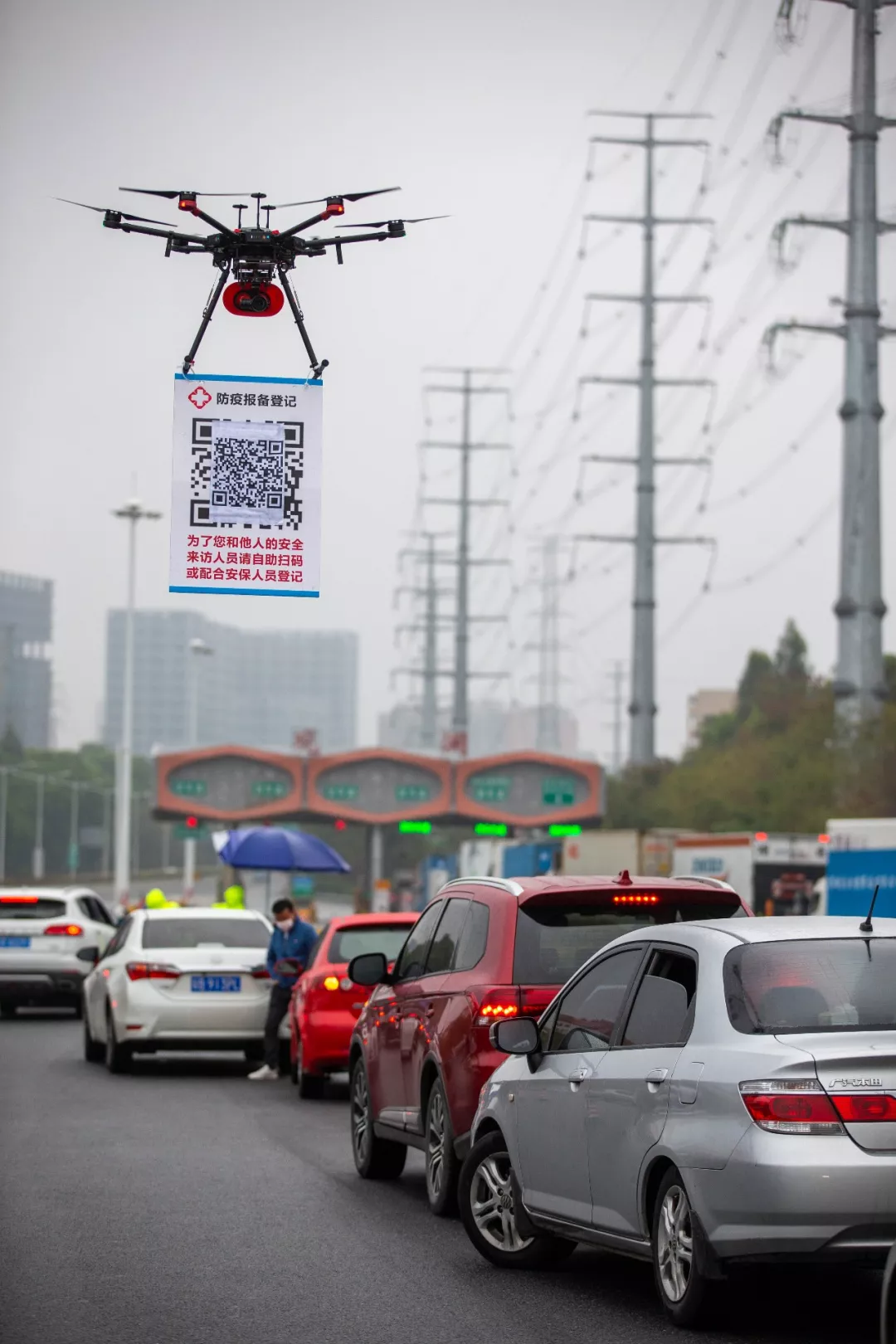 2月11日,在G94高速深圳觀瀾收費處,深圳龍華機訓大隊無人機飛行隊的民警操作懸掛有申報二維碼的無人機在候檢的車輛間飛行。