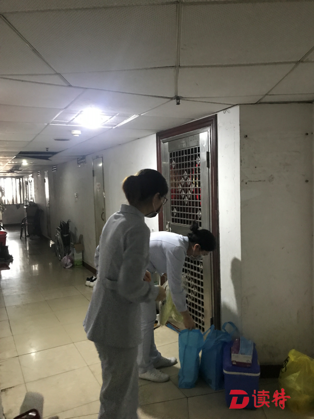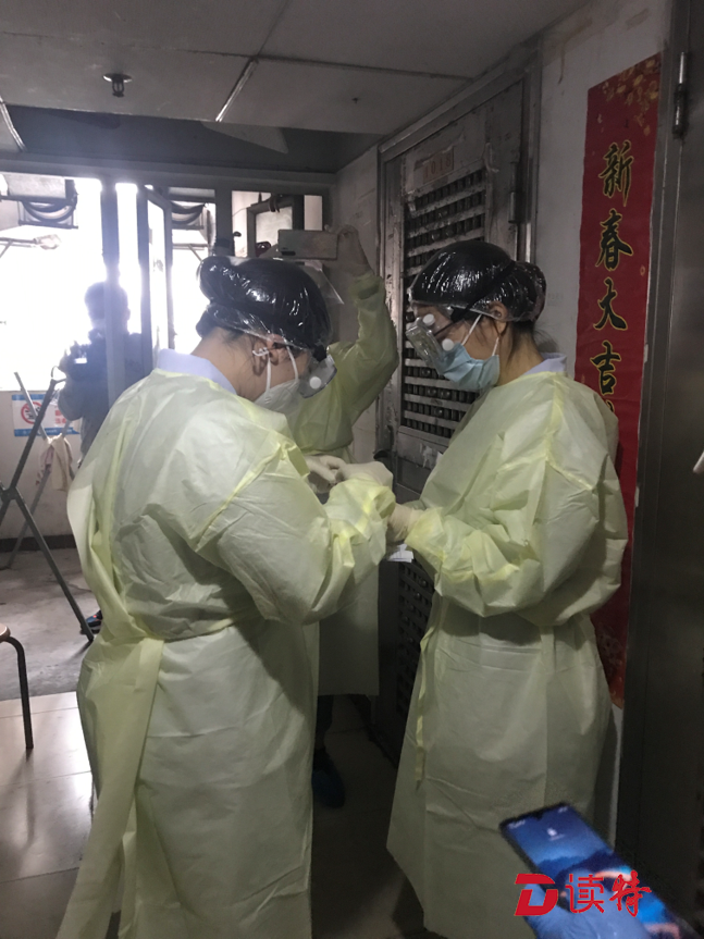孫女士打開門,將工作人員遞進(jìn)去的防護(hù)裝備穿戴完畢?!盀榱吮Wo(hù)醫(yī)護(hù)人員的安全,減少交叉感染的可能性,所有的上門檢測(cè)都會(huì)在樓道里進(jìn)行?!鄙缈抵行墓ぷ魅藛T說(shuō)。提前穿好防隔服等防護(hù)裝備、拿檢測(cè)時(shí)給居民坐的凳子、為凳子消毒,開始進(jìn)行檢測(cè)前就需要做很細(xì)致的準(zhǔn)備工作。