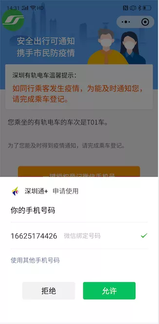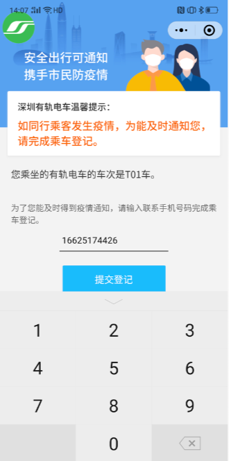第一步:乘客使用微信掃描列車車廂內的登記碼,登記頁面會自動顯示上次登記的手機號或在“深圳通+”小程序中注冊的手機號碼: