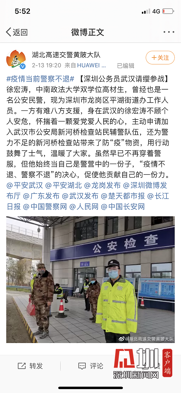 見圳客戶端、深圳新聞網(wǎng)2月16日訊(見圳客戶端、深圳新聞網(wǎng)記者 張凡 通訊員 李上彪 謝華庚)2月15日早上7點(diǎn),來自深圳市龍崗區(qū)平湖街道的黨員徐宏濤就站在了武漢新河公安檢查站的崗位上,開始一天的志愿輔警工作。他是龍崗區(qū)平湖街道黨工委辦公室主任,因春節(jié)回家探親滯留武漢,這些天來,他懷揣著一顆愛黨愛人民的心,主動申請加入武漢市公安局新河檢查站民輔警隊(duì)伍,還為警力不足的檢查站帶來了防疫物資,他用行動回報這片生于斯長于斯的土地,更展現(xiàn)了一名龍崗優(yōu)秀黨員的擔(dān)當(dāng)與風(fēng)貌。