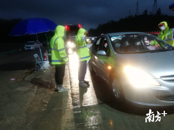 “富地崗防疫檢查點(diǎn)地理位置受限,條件相對(duì)艱苦。但我們不被困難所嚇到,不被風(fēng)雨而耽擱我們查驗(yàn)工作?!逼旱亟值傈h員干部和工作人員在大雨中堅(jiān)守,就在晚上10:30左右,該卡點(diǎn)攔截2臺(tái)粵B牌車輛,來自湖北黃岡籍人員一家5人,居住橫崗街道,坪地街道值班領(lǐng)導(dǎo)立即協(xié)調(diào)安排交警、派出所帶車,并成功和橫崗街道對(duì)接。
