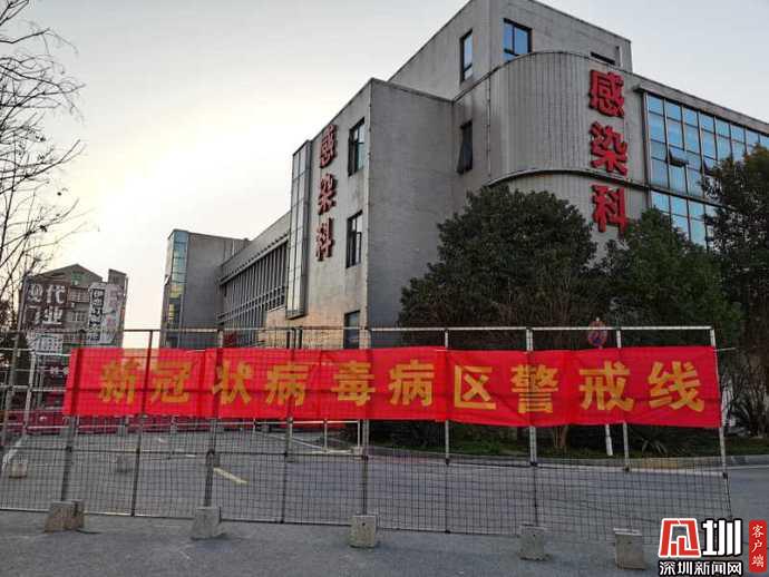在進(jìn)入大樓的通道上,設(shè)置有警戒線,寫著"新冠病毒病區(qū)警戒線"幾個大字的紅色橫幅非常醒目。