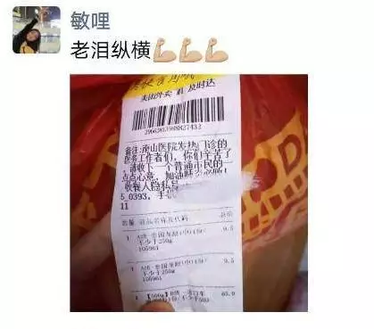 1月30日晚上8點(diǎn)56分,華中科技大學(xué)協(xié)和深圳醫(yī)院(南山醫(yī)院)手外科護(hù)士王敏在朋友圈曬了一張照片,照片里是一個紅色塑料袋上貼著一張外賣單,備注上寫著,“南山醫(yī)院發(fā)熱門診的醫(yī)務(wù)工作者們,你們辛苦了!請收下一個普通市民的一點(diǎn)點(diǎn)心意,加油,肺炎必??!”