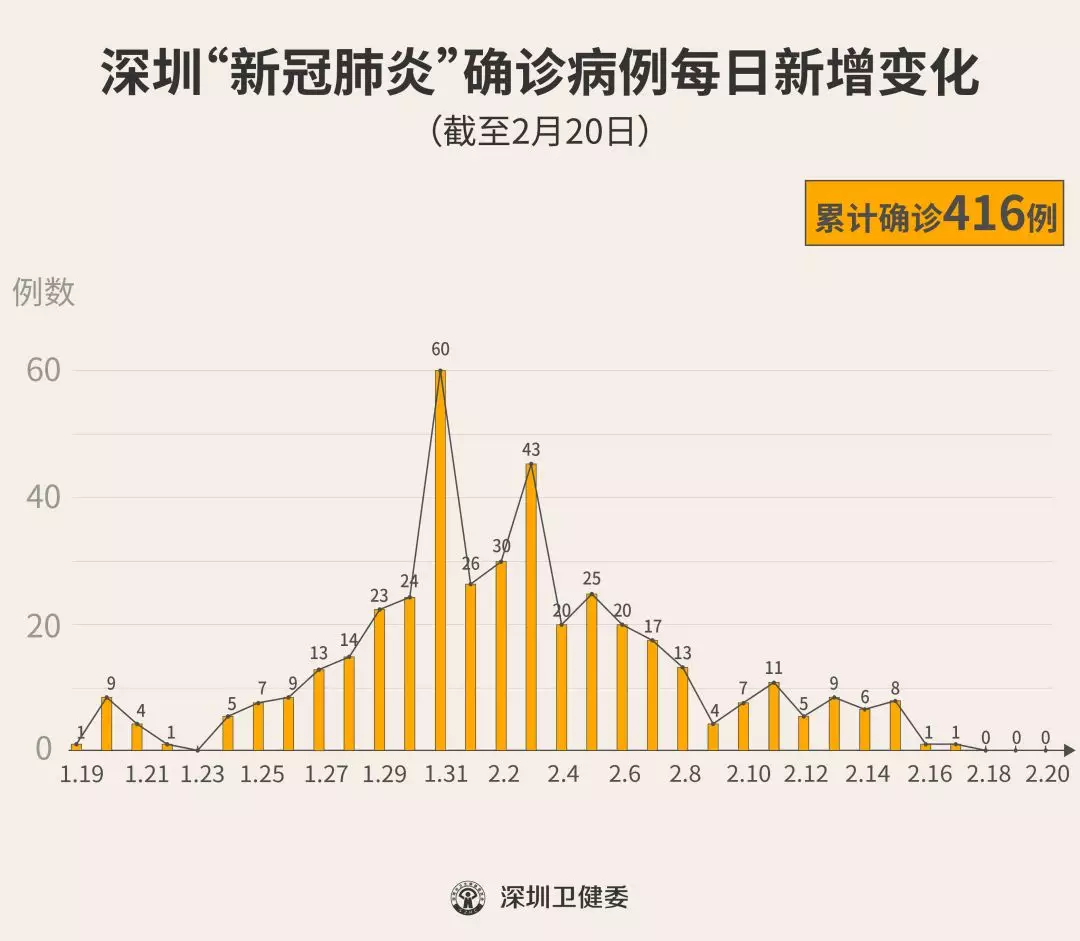 截至2月20日24時,深圳累計報告“新冠肺炎”確診病例416例。2月20日當天全市無新增確診病例。