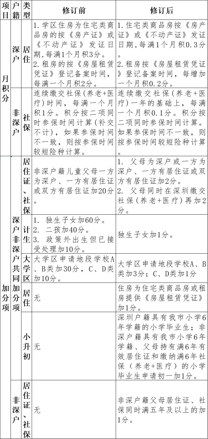 (3)非深圳戶籍兒童父母為深圳戶籍或雙方有居住證或一方有居住證另一方為深圳戶籍由原來加20分調(diào)整為2分;同時(shí),加分對象由非深戶調(diào)整為所有申請兒童。