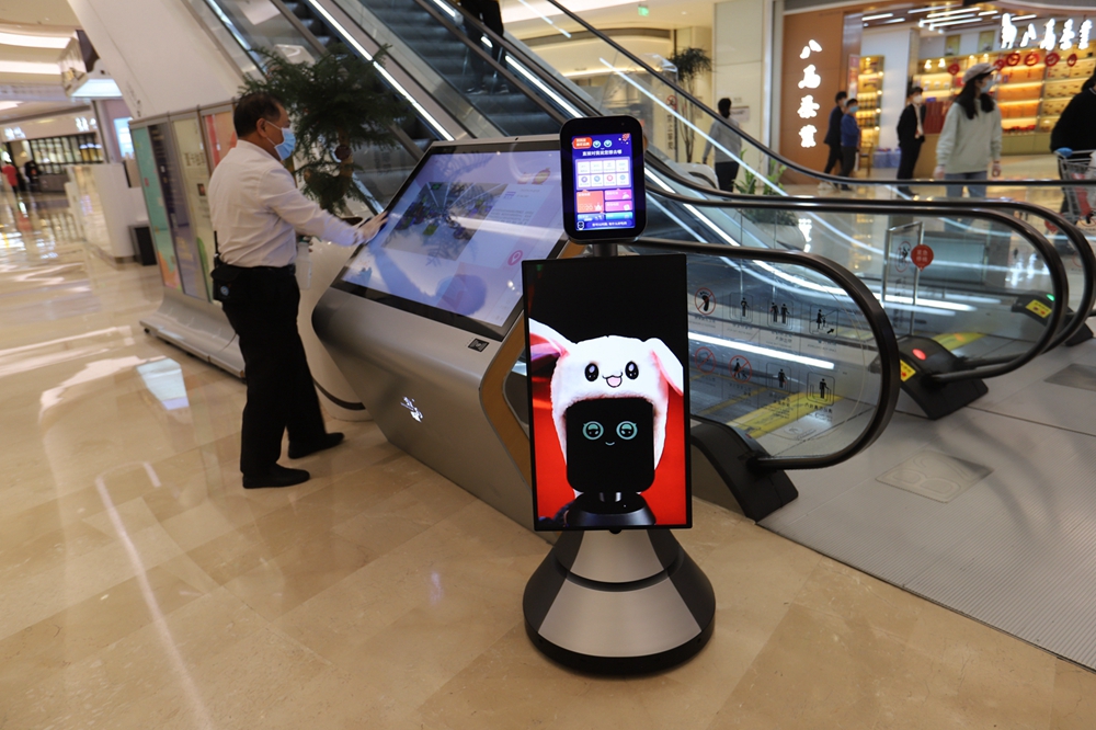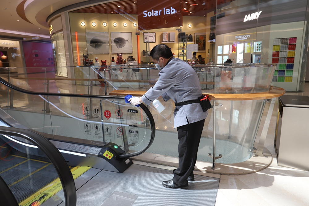 走在商場中,隨時可以看到保潔人員在消毒清潔。在商場一樓中庭導(dǎo)購屏和導(dǎo)購機(jī)器人處,保潔人員用消毒水反復(fù)擦拭屏幕。據(jù)悉,商場每小時巡回對扶梯、電梯、衛(wèi)生間、消防通道、導(dǎo)視屏、扶手欄桿、休閑椅、門把手、垃圾房、垃圾桶等地進(jìn)行消毒。