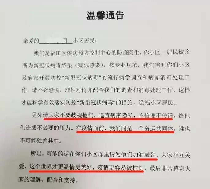 “疫情面前,我們同是一個(gè)命運(yùn)共同體”“大家相互關(guān)愛,這個(gè)世界才更溫情美好,疫情更容易被控制……”1月30日,位于深圳福田區(qū)的一小區(qū)出現(xiàn)新冠肺炎疑似感染病例,福田區(qū)疾病預(yù)防控制中心的防疫醫(yī)生隨即發(fā)布了這則通告,瞬間刷屏了深圳人的朋友圈。通告除了呼吁小區(qū)居民配合調(diào)查及消毒處理工作外,還特地懇請大家“不要歧視,在疫情面前,我們是同一個(gè)命運(yùn)共同體,誰也不可能獨(dú)善其身?!绷攘葦?shù)字的“請求”,感動(dòng)無數(shù)人。