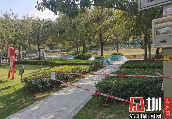 在光明區(qū)新城公園,記者看到公園里游樂設(shè)施區(qū)域已被封,暫未對外開放。道路兩旁的小喇叭正播放著防疫宣傳廣播,提醒市民出門戴好口罩,勤洗手,注意防護(hù)。