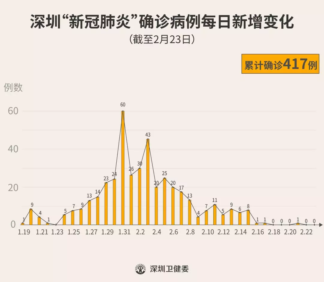 截至2月23日24時(shí),深圳累計(jì)報(bào)告“新冠肺炎”確診病例417例。2月23日當(dāng)天全市無(wú)新增確診病例。 ▲新增出院病例已超過(guò)新增確診病例 累計(jì)報(bào)告確診病例中,男性197例、女性220例。 按照病例管理地區(qū)劃分,南山區(qū)87例、福田區(qū)81例、龍崗區(qū)71例、寶安區(qū)62例、龍華區(qū)34例、羅湖區(qū)32例、光明區(qū)11例、坪山區(qū)7例、鹽田區(qū)6例、大鵬新區(qū)2例、其他(指由機(jī)場(chǎng)、車站、碼頭、關(guān)口、路卡等直接送往定點(diǎn)醫(yī)院的)24例。 目前,重癥5例、危重癥8例,死亡3例,累計(jì)出院237例。 177例確診病例均在深圳市第三人民醫(yī)院隔離治療。 159例密切接觸者正在接受醫(yī)學(xué)觀察。 資料來(lái)源:深圳市疾控中心、深圳市衛(wèi)健委、廣東省衛(wèi)健委