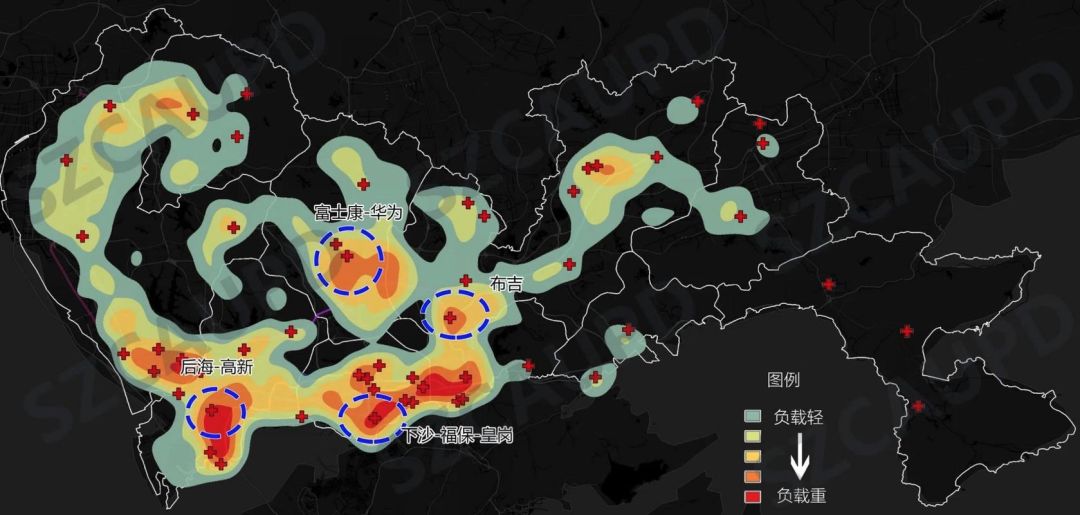 通過疊加疫情風(fēng)險(xiǎn)、門診負(fù)荷與服務(wù)半徑,發(fā)現(xiàn)部分區(qū)域的應(yīng)急醫(yī)療服務(wù)最具超載風(fēng)險(xiǎn)。這些地區(qū)包括富士康-華為片區(qū)、下沙-福保-皇崗片區(qū)、后海-高新園片區(qū)、布吉片區(qū)等,也就是說,這些地區(qū)的疫情發(fā)生風(fēng)險(xiǎn)較高、人群密度與規(guī)模較大、而醫(yī)療設(shè)施相對有限,假若疫情爆發(fā),則其對應(yīng)的發(fā)熱門診將承載較大壓力。