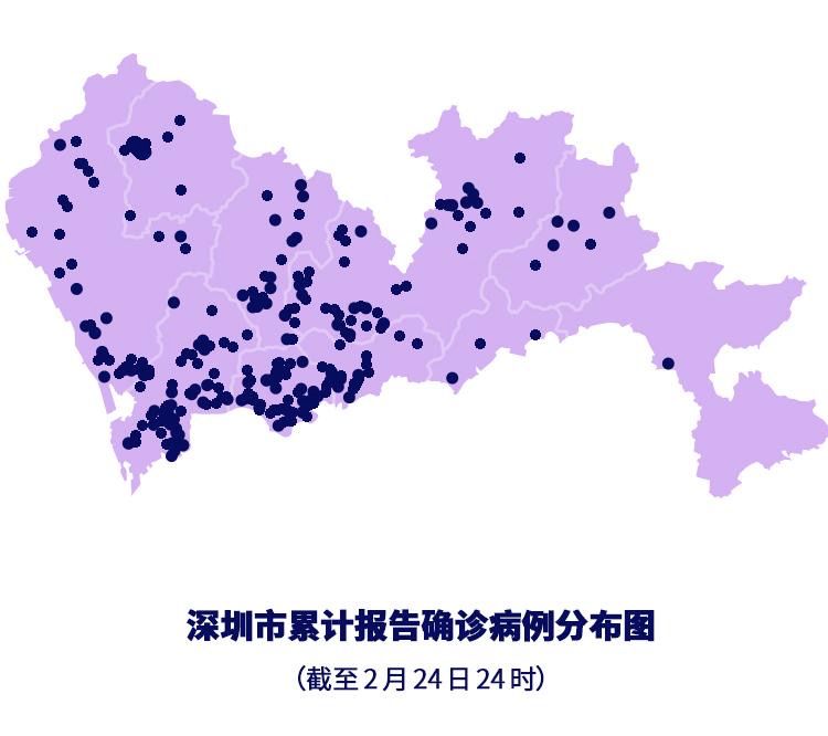此前,深圳的防控風(fēng)險(xiǎn)主要在于“涉疫”小區(qū)。截至2月24日24時(shí),深圳市累計(jì)報(bào)告確診病例417例,分布于250個(gè)小區(qū)(場所),主要集中在城市中心地區(qū)。從下面的數(shù)據(jù)分布圖來看,我們可以看到了特別是在深圳的東南部,數(shù)點(diǎn)相對密集,而這恰好又與我市科創(chuàng)企業(yè)的分布發(fā)生一定程度的重合。