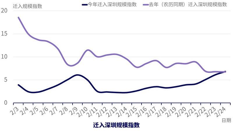 從百度遷徙地圖看到,2月21日起,深圳已連續(xù)4天居全國熱門遷入地榜首,同時(shí),遷入規(guī)模指數(shù)也逐漸接近去年農(nóng)歷同期水平。