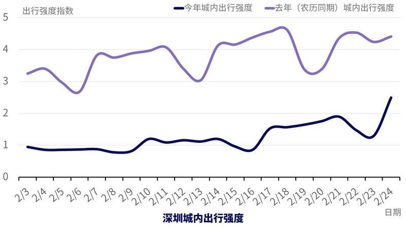 人員的遷入,復(fù)工的進(jìn)行時(shí),讓深圳久違的早高峰再次出現(xiàn),2月24日,深圳早高峰時(shí)段出行車輛42.09萬輛,較上一周上升58%,城內(nèi)出行強(qiáng)度達(dá)去年農(nóng)歷同期的56.7%。