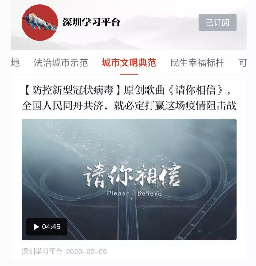 在深圳市委宣傳部的統(tǒng)一部署下,深圳的創(chuàng)作者們在短時間內(nèi)創(chuàng)作出眾多暖人心、聚力量的作品,《請你相信》是首批推出的作品之一。2月5日,《原創(chuàng)歌曲<請你相信>,全國人民同舟共濟,就必定打贏這場疫情阻擊戰(zhàn)》視頻登上“學(xué)習(xí)強國”全國平臺“推薦”欄目,在朋友圈廣為傳播,反響良好。