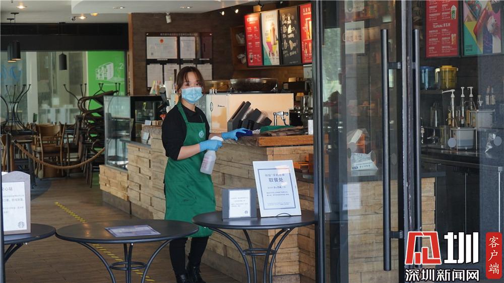咖啡館都采用門(mén)口取餐帶走的銷售模式,圖為正在進(jìn)行消毒情節(jié)的員工。