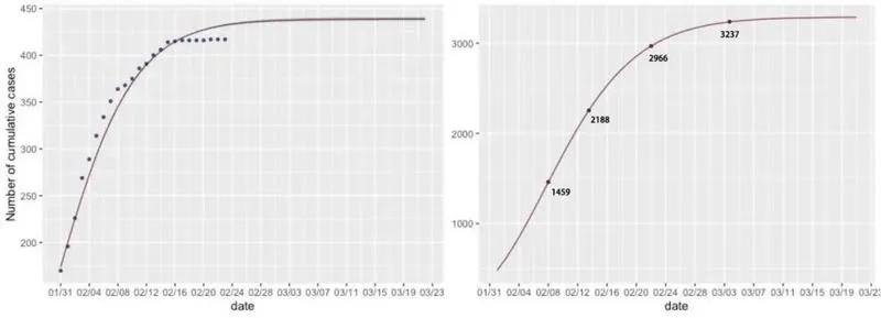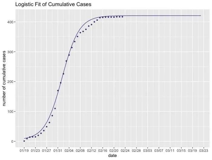 進一步地擬合深圳新冠肺炎的累計確診人數(shù),并對累計確診人數(shù)做出預測。可以看到,模型預測自2月28日起病例數(shù)不再增加,預測得到最終的累計確診人數(shù)收斂在422人左右。