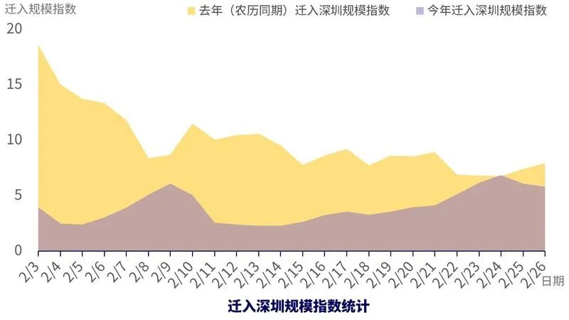 年前,深圳人口達2000萬人,春節(jié)期間最低830多萬人。從百度地圖遷徙-春運期間遷入深圳趨勢可以看到,相比去年,年后遷入深圳規(guī)模較去年一直呈現(xiàn)平穩(wěn)的低態(tài)勢,但在2月9日呈現(xiàn)出一波返程小高峰,2月14日,在深人數(shù)約1300萬人,目前約1600萬人,也就是說年后至今約有七百多萬人從外地返回深圳。
