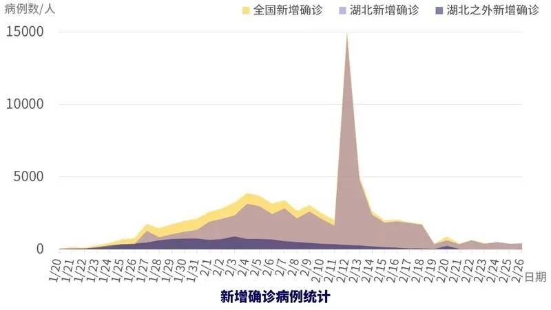 目前每日新增確診病例呈下降趨勢。2月3日,非湖北地區(qū)新增確診病例達到最高峰890例,之后逐漸下降(2月20日監(jiān)獄系統(tǒng)新增確診病例,造成數(shù)據(jù)波動),2月26日新增確診病例降至24例,為最高峰的2.7%,前一天新增病例5例,僅為最高峰的0.56%。湖北地區(qū)新增確診病例在2月4日達到最高峰3156例(2月12日,2月13日,由于確診標準的改變,造成數(shù)據(jù)波動),隨后基本呈下降趨勢,2月26日新增確診409例,為最高峰的12.96%。