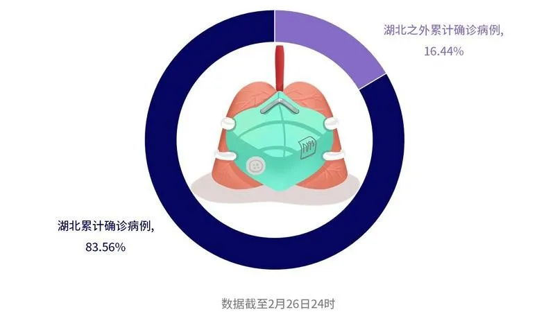 截至2月26日24時,全國累計確診病例78497例,其中,湖北地區(qū)占比83.56%。