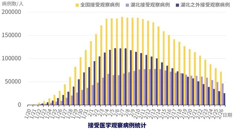 還值得關(guān)注的是正在接受醫(yī)學觀察的人數(shù),在全國嚴格管控的情況下,未來新增確診病例很大比例會來自這部分人群。從數(shù)據(jù)中可以看到,非湖北地區(qū)接受醫(yī)學觀察人數(shù)正在快速下降,湖北地區(qū)的也在穩(wěn)步下降中,這可能預示著未來新增確診病例也將下降。