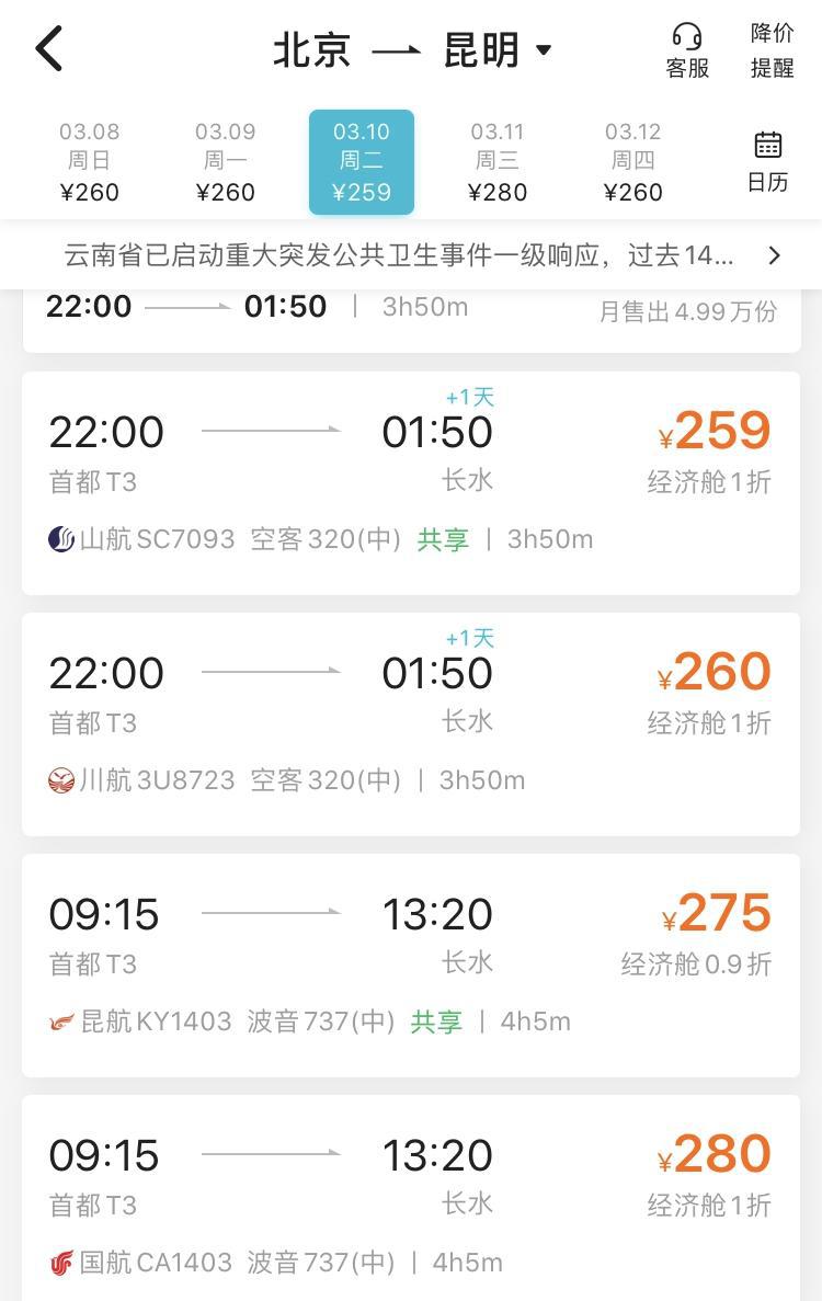 此外,3月份,由北京、上海等城市出發(fā)的航班也出現(xiàn)了1折左右的"白菜價"。比如去哪兒旅行 APP上顯示,3月10日,北京飛昆明的山航 SC7093航班,機票價格最低為259元,折扣為經(jīng)濟艙全票的1折。當天,川航3U8723、昆航 KY1403、國航 CA1403等航班的最低票價,也僅為經(jīng)濟艙全票的1折左右,價格分別為260元、275元、280元。