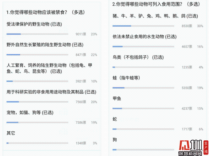 2月26日,深圳新聞網(wǎng)微信公眾號發(fā)布正在征求意見的《條例》后,當天傍晚有超過9000名網(wǎng)友參與投票,熱情高漲的網(wǎng)友還留言戲稱廣東菜譜“水魚燜雞”或許從此退出,也有人猜測以田雞(牛蛙)為主打的餐館要“涼涼”了。(相關(guān)報道:深圳最嚴禁食野生動物條例征求意見近萬網(wǎng)友投票:甲魚牛蛙該不該被禁?)