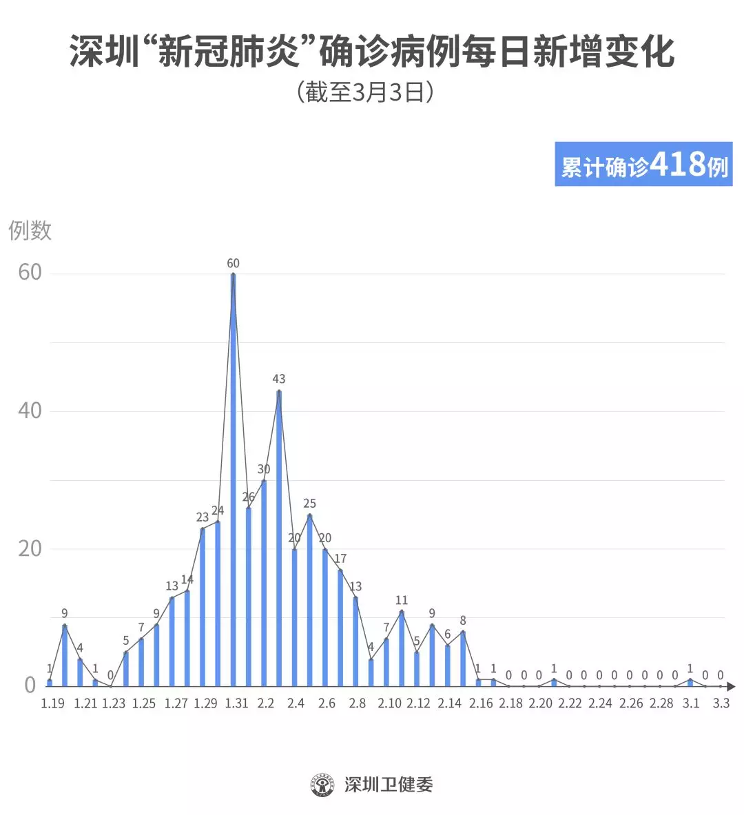 截至3月3日24時(shí),深圳累計(jì)報(bào)告“新冠肺炎”確診病例418例。3月3日當(dāng)天全市無(wú)新增確診病例,當(dāng)天出院病例9例(從2月26日起不再公布出院個(gè)案)。