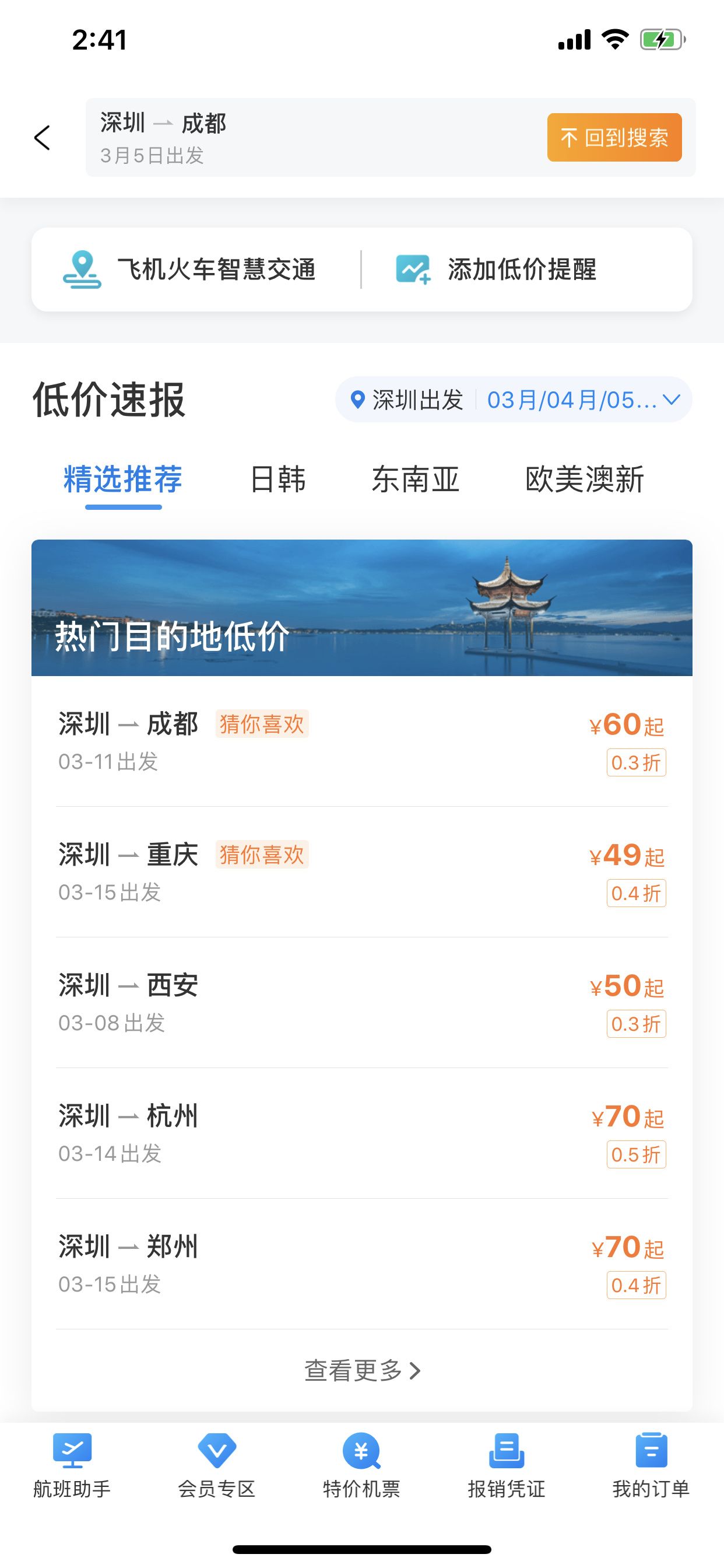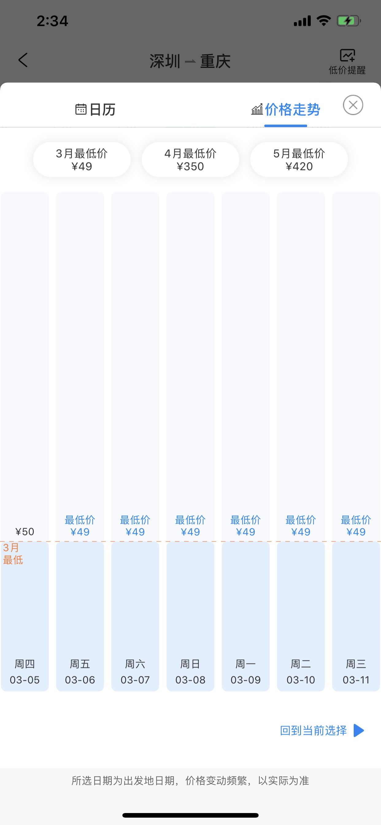 3月5日,記者在飛豬、攜程等第三方機票預(yù)訂平臺看到,近日從深圳飛往重慶、成都等地的多條航線,兩位數(shù)的“白菜價”機票比比皆是,如深圳飛重慶機票本身價格才49元,低價一直持續(xù)到3月底。一平臺客服告訴記者,票價真實,這是航空公司的定價。