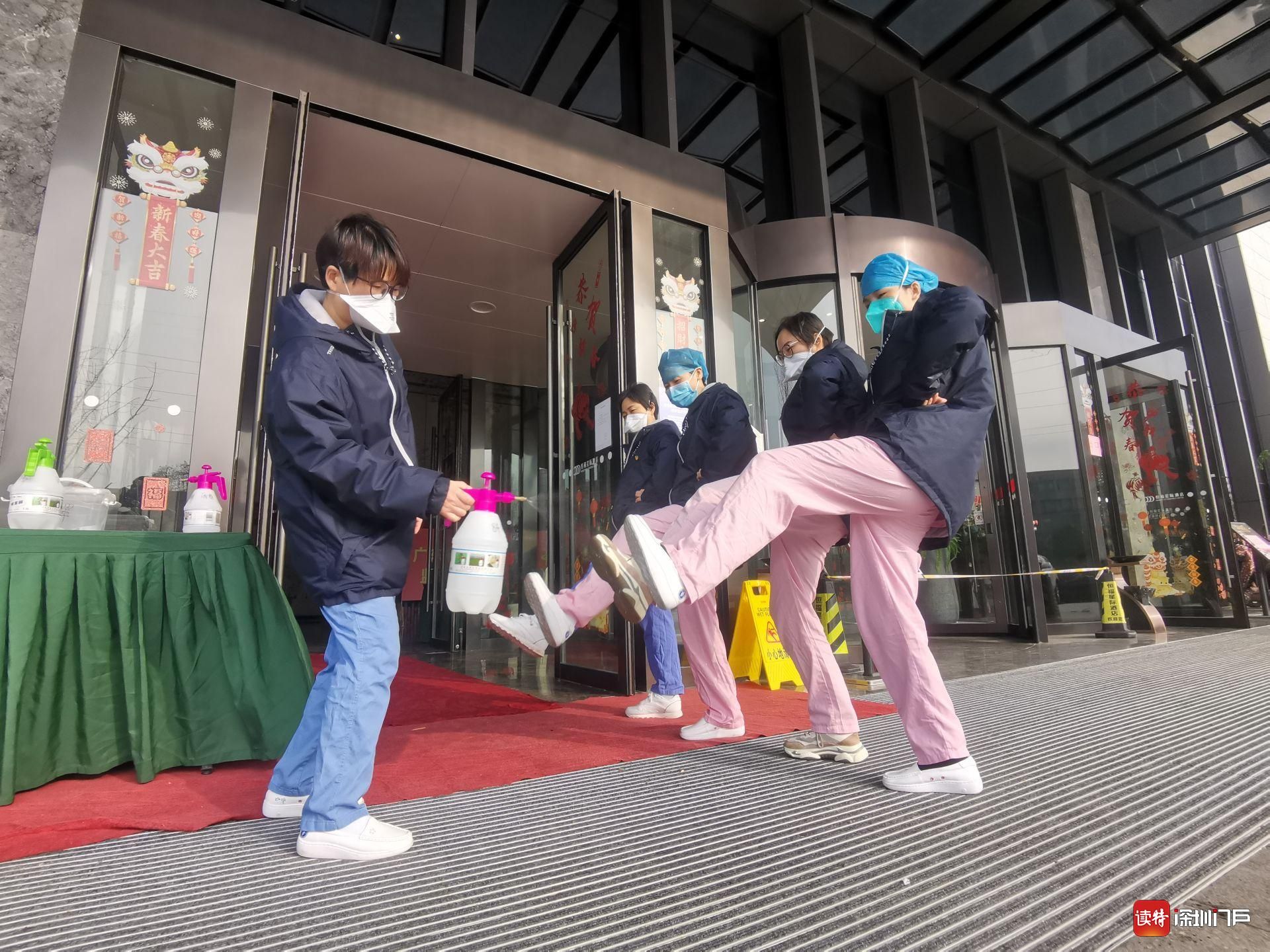 進入駐地酒店前,深圳醫(yī)療隊隊員列隊用酒精進行鞋底消毒