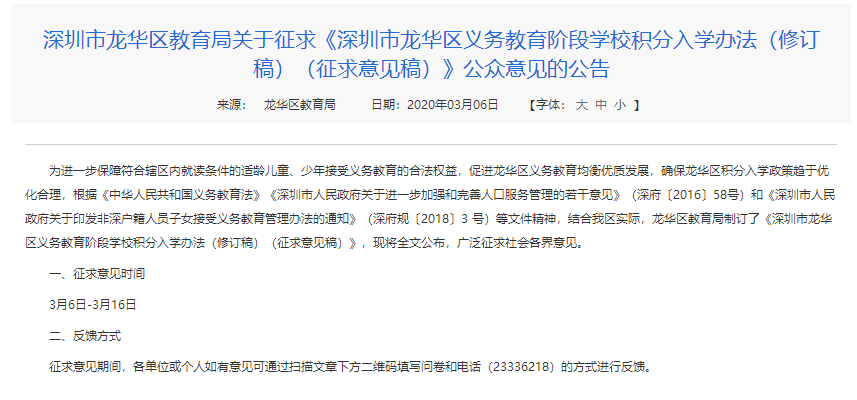 3月6日,深圳市龍華區(qū)教育局發(fā)布關(guān)于征求《深圳市龍華區(qū)義務(wù)教育階段學(xué)校積分入學(xué)辦法(修訂稿)(征求意見(jiàn)稿)》公眾意見(jiàn)的公告。