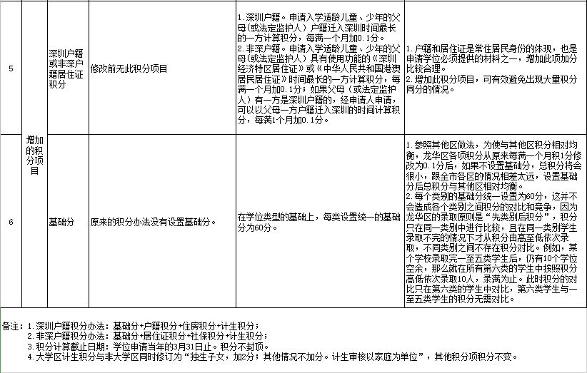 劃重點(diǎn):政策內(nèi)或全面二孩擬不再加分,獨(dú)生子女加2分;深圳戶籍自購(gòu)商品房產(chǎn)擬改為以房產(chǎn)購(gòu)買(mǎi)日期計(jì)算積分;非深戶籍?dāng)M按照養(yǎng)老保險(xiǎn)和醫(yī)療保險(xiǎn)兩種險(xiǎn)種同時(shí)繳納的時(shí)間計(jì)算積分;新增深圳戶籍或非深戶籍居住證積分;新增基礎(chǔ)分60分。