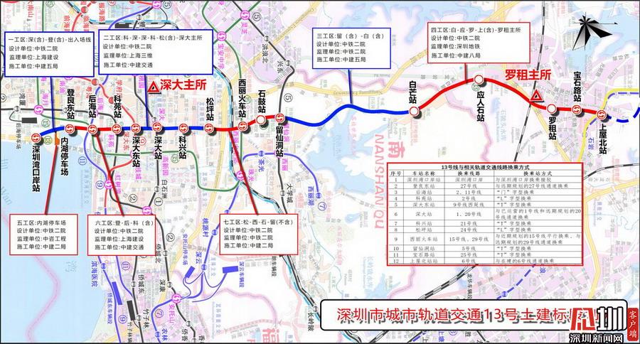 據(jù)了解,地鐵13號線由南至北穿過南山區(qū)、寶安區(qū)和光明新區(qū)。項目共設(shè)車站16座,線路總長22.436公里,出入線與后海站接軌,將穿越已運營的地鐵1號線、2號線、5號線、11號線。由于沿途工程地質(zhì)條件復(fù)雜、換乘站多、工程實施難度大、長區(qū)間盾構(gòu)、拆遷工作繁重、交通疏解復(fù)雜等原因,13號線被稱為深圳地鐵建設(shè)史上最難的地鐵線路之一。
