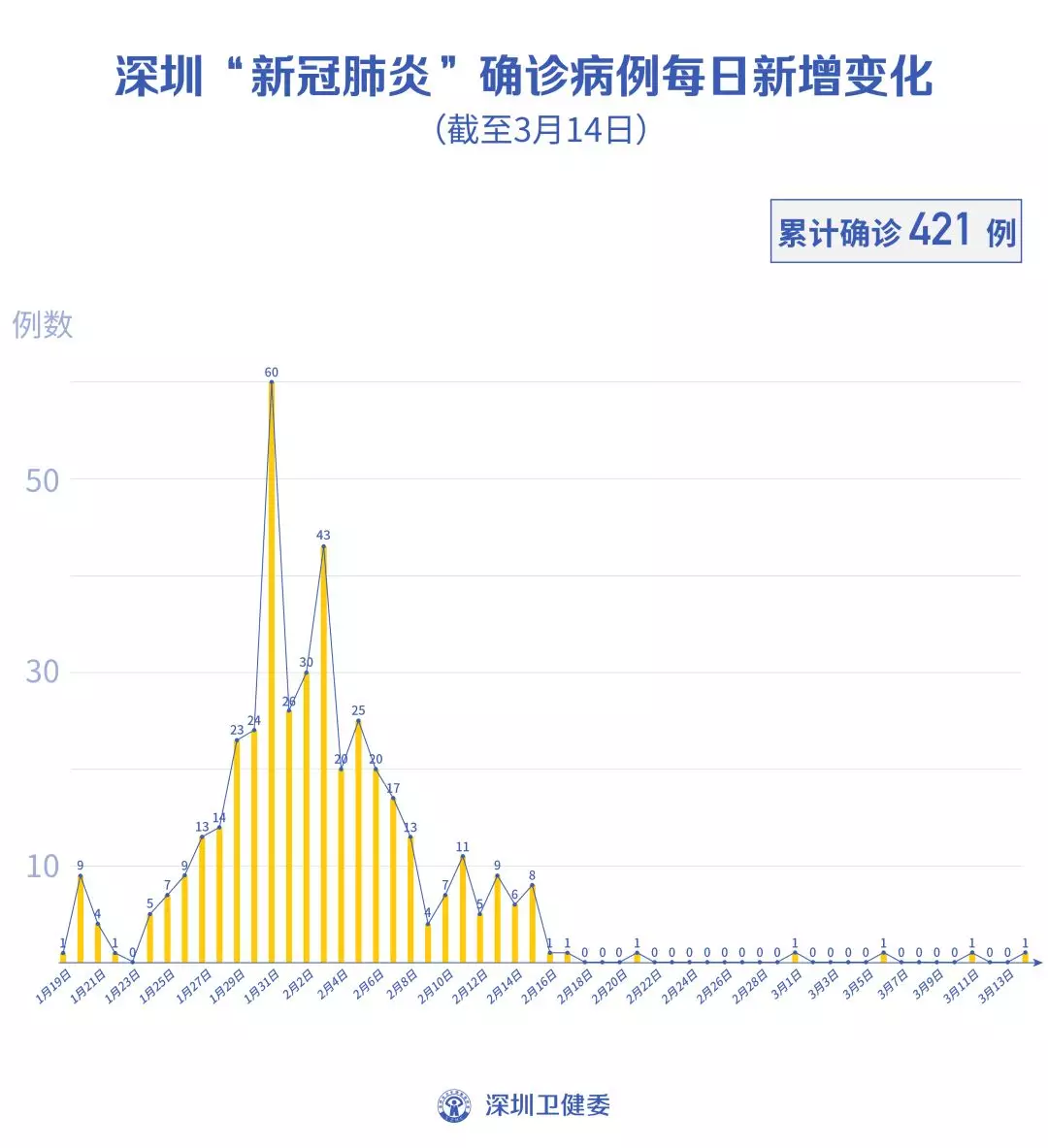 截至3月14日24時,深圳累計報告“新冠肺炎”確診病例421例。3月14日當(dāng)天新增1例,出院3例。