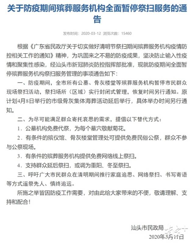 汕頭全市所有公墓、骨灰樓堂等殯葬服務(wù)機(jī)構(gòu)暫停市民群眾現(xiàn)場(chǎng)祭掃活動(dòng),祭掃場(chǎng)所(區(qū)域)實(shí)行封閉式管理,并提倡以下替代方式:公墓機(jī)構(gòu)免費(fèi)代祭,為每個(gè)墓穴敬獻(xiàn)菊花;有條件的殯儀館、骨灰樓堂管理處可提供免費(fèi)民俗公祭,群眾不參與公祭現(xiàn)場(chǎng);有條件的殯葬服務(wù)機(jī)構(gòu)提供免費(fèi)網(wǎng)絡(luò)線上祭掃;支持群眾延后祭掃,或調(diào)為重陽(yáng)、冬至祭掃。
