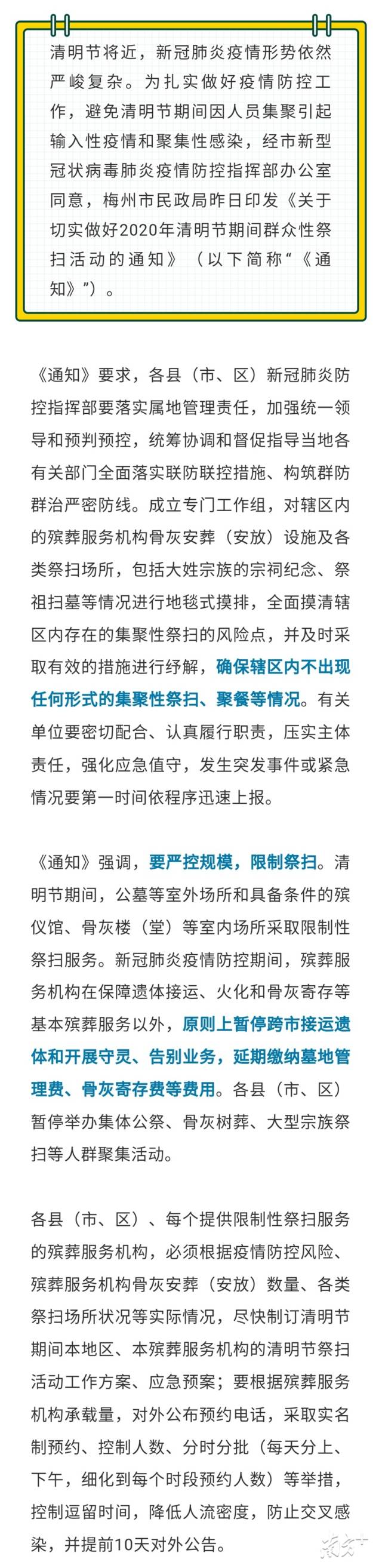 根據(jù)要求,廣東暫停舉辦集體公祭、骨灰海葬、骨灰樹(shù)葬等人群聚集活動(dòng)。各地級(jí)以上市新冠肺炎防控指揮部要盡快研究決定清明節(jié)期間本地區(qū)殯葬服務(wù)機(jī)構(gòu)暫?;蛘呦拗萍罀叻?wù),并對(duì)外公告。疫情防控風(fēng)險(xiǎn)較高的,暫停祭掃服務(wù);具備條件且防控措施落實(shí)到位的,可提供限制性祭掃服務(wù)。