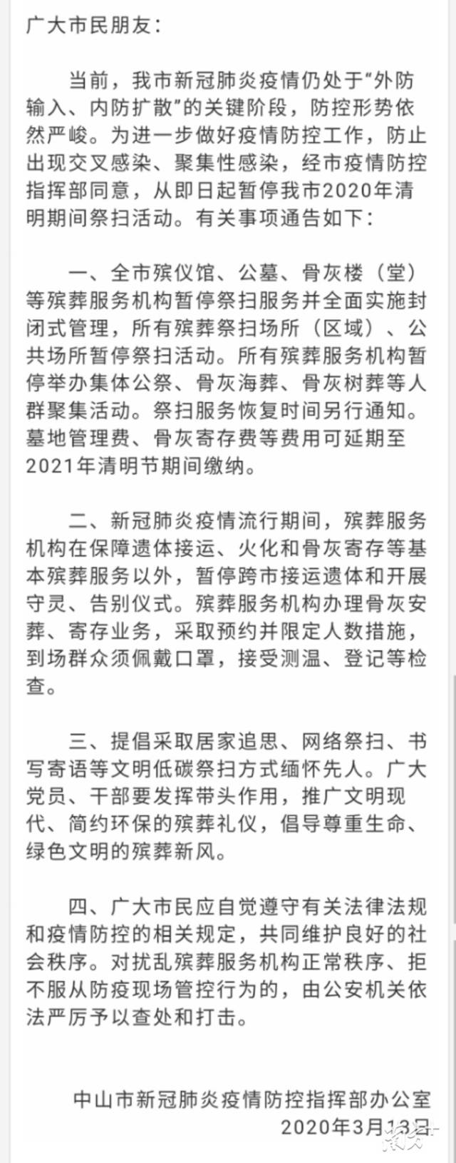 中山全市所有殯葬祭掃場(chǎng)所(區(qū)域)、公共場(chǎng)所暫停祭掃活動(dòng)。殯葬服務(wù)機(jī)構(gòu)辦理骨灰安葬、寄存業(yè)務(wù),采取預(yù)約并限定人數(shù)措施。