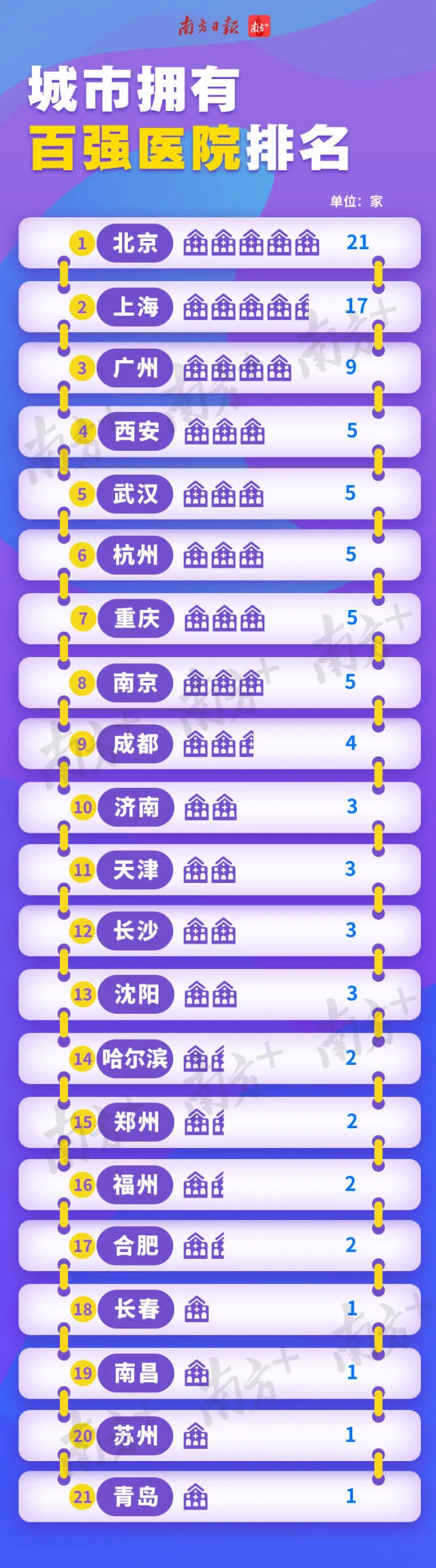 南方經(jīng)濟(jì)智庫梳理后發(fā)現(xiàn),全國(guó)排名前100的醫(yī)院中,47所被北京、上海、廣州囊括。前10個(gè)城市包攬幾乎總數(shù)80%的百?gòu)?qiáng)醫(yī)院。