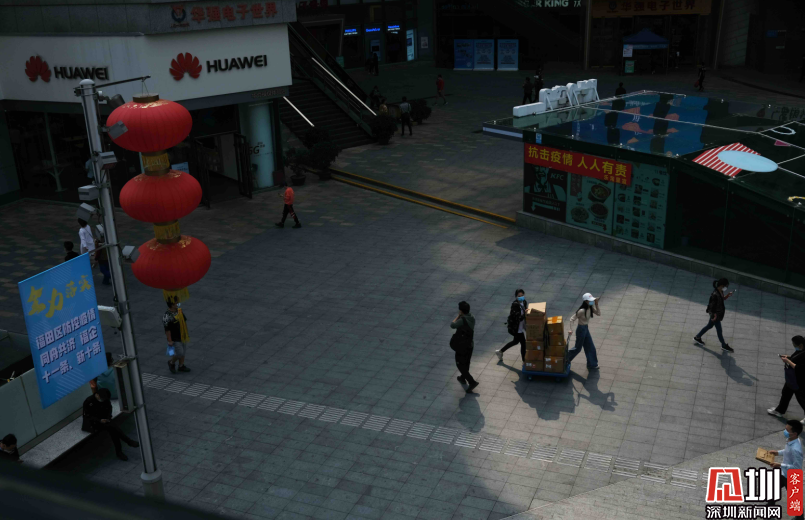3月16日,華強北步行街上,人流量明顯增多,兩位推著平板車運送貨物的人走過。