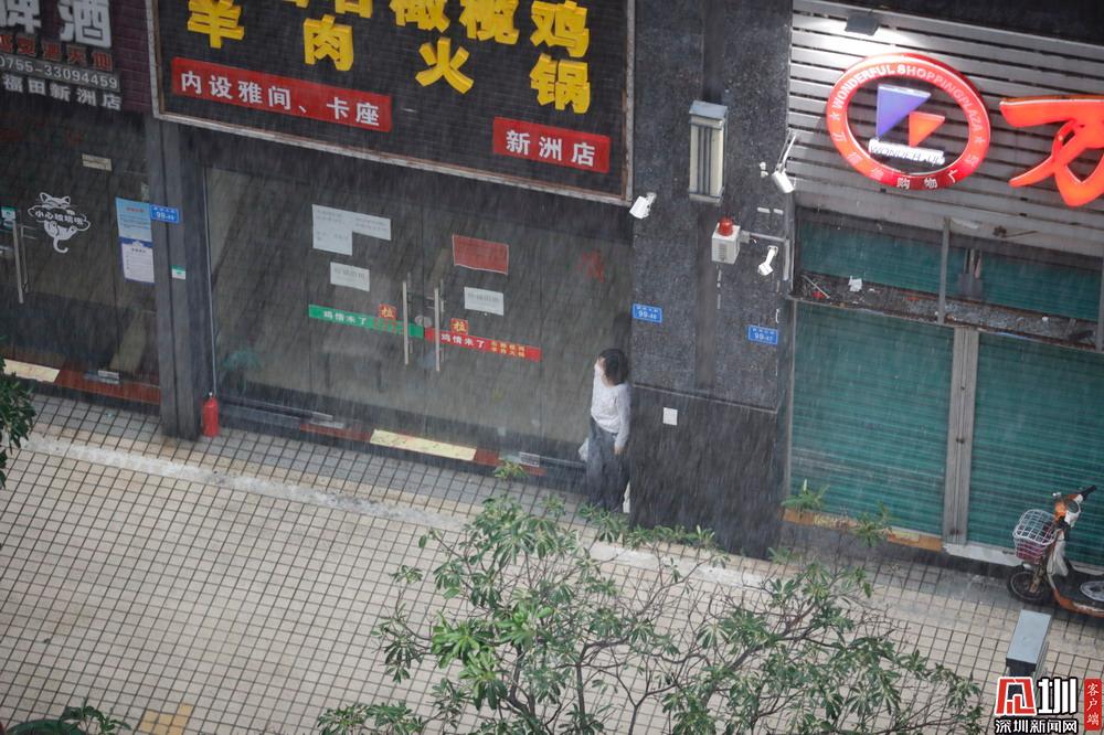 福田新洲村,一位沒(méi)帶傘的市民在屋檐下躲雨。