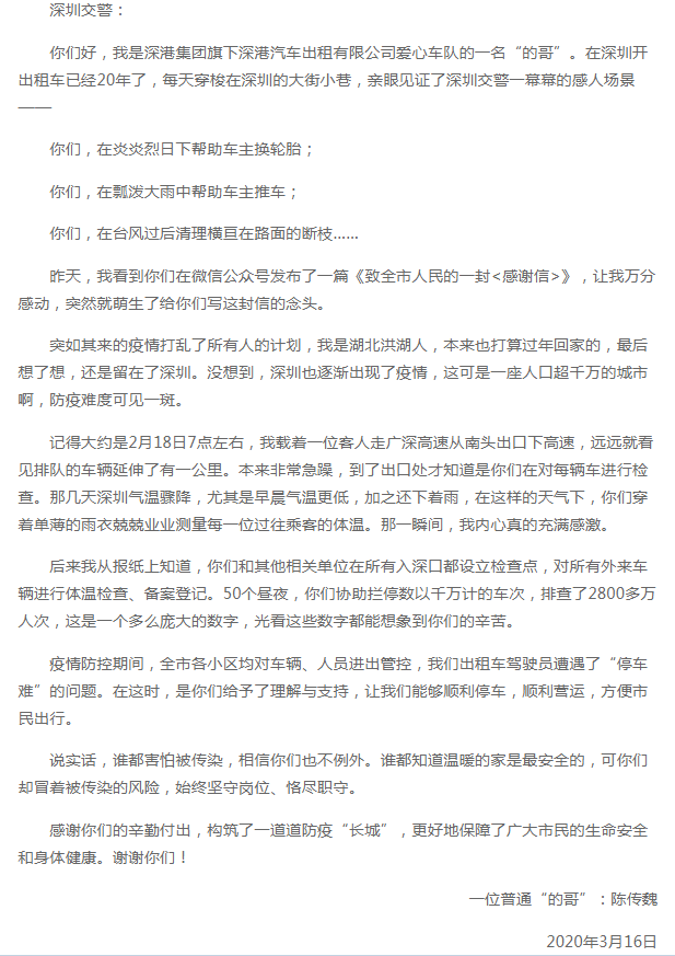 3月16日,深圳交警在微信公眾號(hào)發(fā)了一封感謝信。