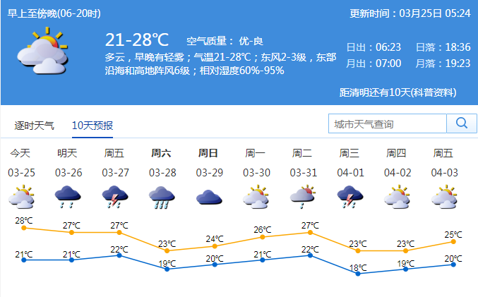 見(jiàn)圳客戶(hù)端·深圳新聞網(wǎng)2020年3月25日訊 近期我市氣溫明顯上升,連續(xù)3天最高氣溫達(dá)28℃左右。今日深圳多云,早晚有輕霧;氣溫21-28℃;東風(fēng)2-3級(jí),東部沿海和高地陣風(fēng)6級(jí);相對(duì)濕度60%-95%。