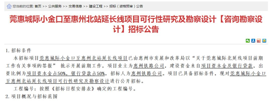 公告顯示,莞惠城際小金口至惠州北站延長線正進(jìn)行可行性研究及勘察設(shè)計(jì)招標(biāo),招標(biāo)金額為7452.47萬元(含稅價(jià))。