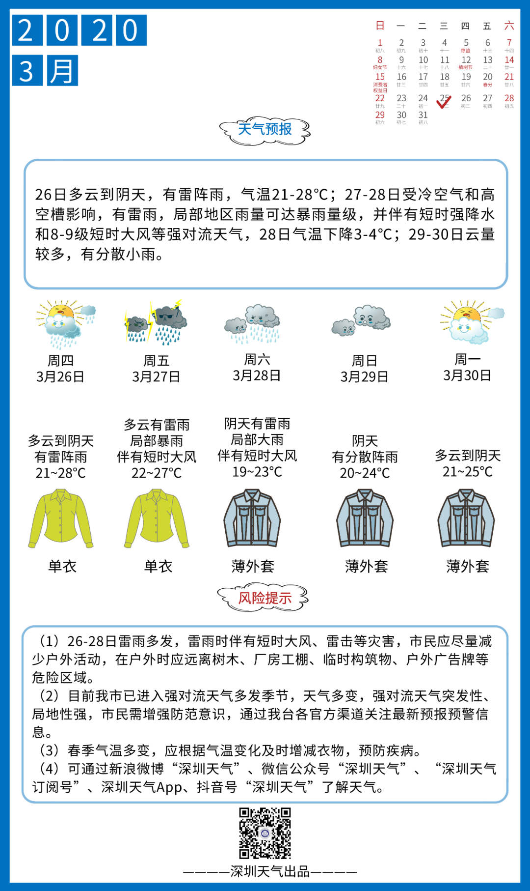 28日白天受冷空氣影響,氣溫下降3-4℃,體感清涼。29-30日云量較多,有分散小雨,26-28日雷雨多發(fā),雷雨時(shí)伴有短時(shí)大風(fēng)、雷擊等災(zāi)害,市民應(yīng)盡量減少戶外活動(dòng),在戶外時(shí)應(yīng)遠(yuǎn)離樹木、廠房工棚,臨時(shí)構(gòu)筑物、戶外廣告牌等危險(xiǎn)區(qū)域,春季氣溫多變,應(yīng)根據(jù)氣溫變化,及時(shí)增減衣物,預(yù)防疾病。