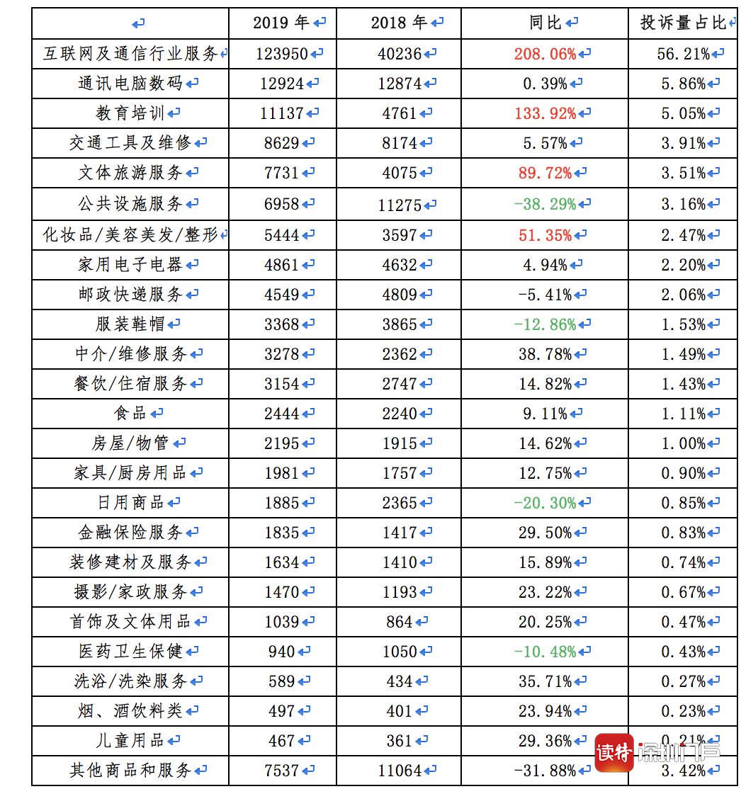 據(jù)統(tǒng)計,2019年,互聯(lián)網(wǎng)及通信行業(yè)服務、通訊電腦數(shù)碼、教育培訓行業(yè)投訴量排名位居前三,分別為123950宗、12924宗、11137宗,分別占全年投訴總量的56.21%、5.86%、5.05%。從投訴量變化情況來看,互聯(lián)網(wǎng)及通信行業(yè)服務、文體旅游服務、教育培訓及化妝品/美容美發(fā)/整形四個行業(yè)投訴量同比增長超過50%;公共設施服務、日用商品、服裝鞋帽以及醫(yī)藥衛(wèi)生保健四個行業(yè)投訴量同比下降超過10%。其中公共設施服務類的減幅最大,為38.29%,主要原因為共享出行行業(yè)洗牌,部分企業(yè)退出市場,投訴量隨之下降。