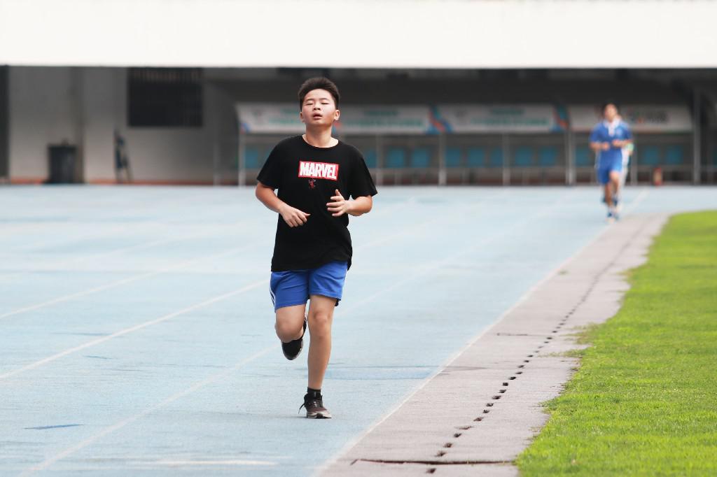 周六上午,在市體育中心體育場(chǎng)田徑場(chǎng)鍛煉的,大部分是即將參與體育中考的學(xué)生。李黨利與妻子一大早就帶著女兒來(lái)到田徑場(chǎng)。他說(shuō):"疫情發(fā)生后女兒基本上待在家里,前一陣子帶她到公園里跑一下,現(xiàn)在終于可以在體育場(chǎng)繼續(xù)訓(xùn)練了。"在女兒練習(xí)跑步時(shí),李黨利也陪著沖刺,練得滿頭大汗。他說(shuō):"戴著口罩跑不太適應(yīng),等疫情結(jié)束了會(huì)跑得更盡興。"