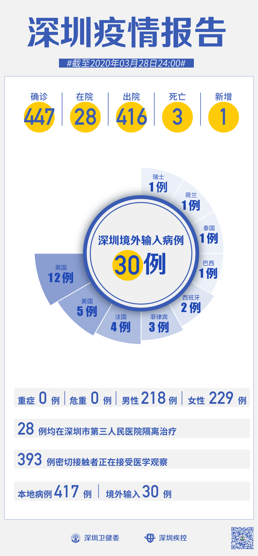 截至3月28日24時,深圳累計報告“新冠肺炎”病例447例。3月28日當天新增1例。