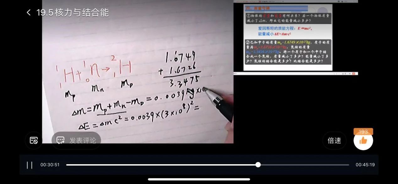 物理科何揚峰老師在執(zhí)教《核力與結(jié)合能》一課時靈活運用手寫板、電腦和手機等多種工具,讓學生能夠同時看到PPT和教師板書畫面,完美地還原了在校學習情境。