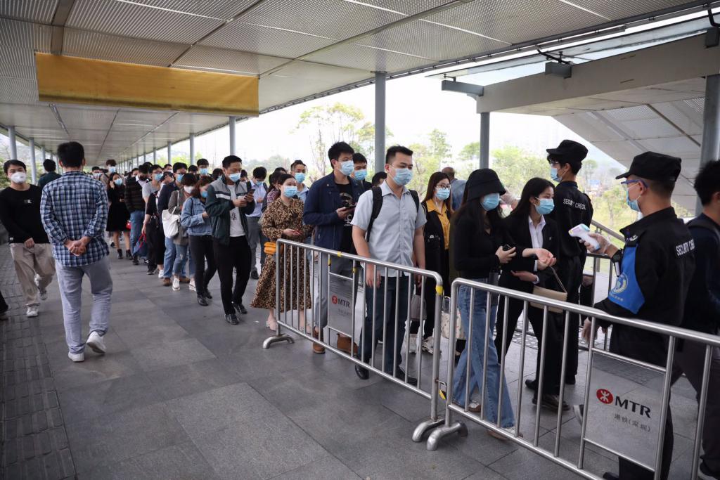 7點(diǎn)30分,深晚另一路記者從五號(hào)線長龍站進(jìn)站,進(jìn)站較順利沒有排長隊(duì),但是車上較擁擠,沒有座位。到達(dá)深圳北站后,在轉(zhuǎn)4號(hào)線去民樂站時(shí)排起了長隊(duì),大概等了13分鐘,才勉強(qiáng)擠進(jìn)4號(hào)線,車上幾乎沒有空間,身體無法動(dòng)彈。8點(diǎn)17分從民樂出站,連同排隊(duì)等車,9站地鐵一共用時(shí)近50分鐘。