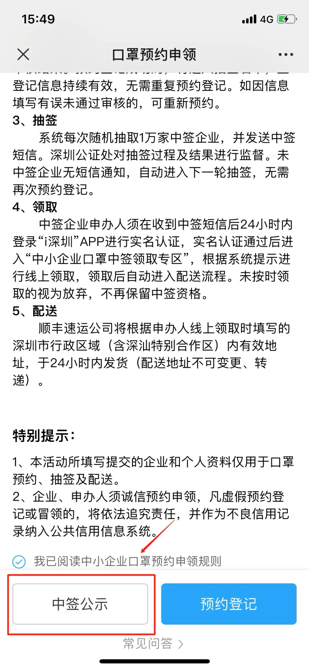 企業(yè)中簽名單:在“i深圳”微信公眾號(hào)首頁(yè)-口罩預(yù)約-中小企業(yè)專區(qū)頁(yè)面的下方“中簽公示”查看