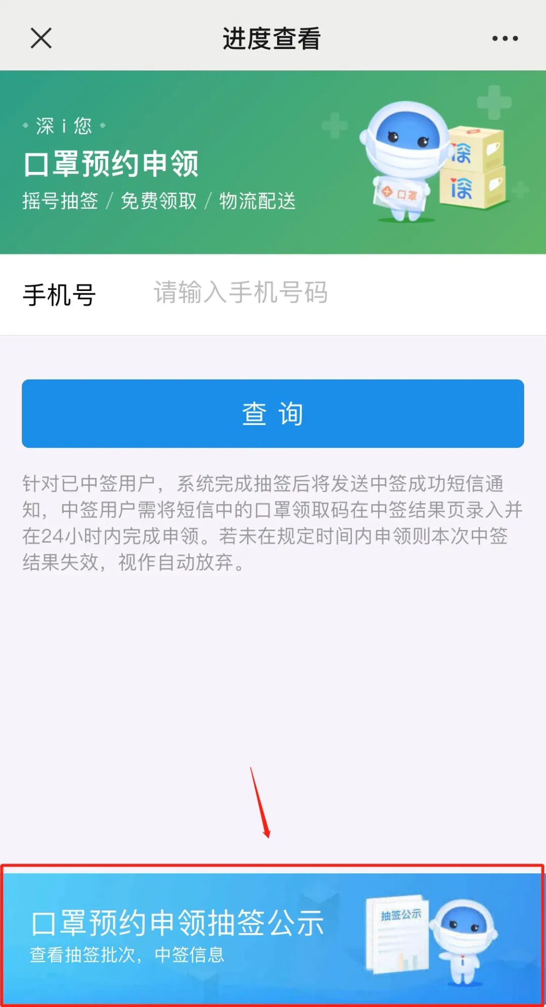 個(gè)人中簽名單:可在“i深圳”微信公眾號(hào)首頁(yè)-口罩預(yù)約-市民專區(qū)-進(jìn)度查看的頁(yè)面下方“口罩預(yù)約申領(lǐng)抽簽公示”查看